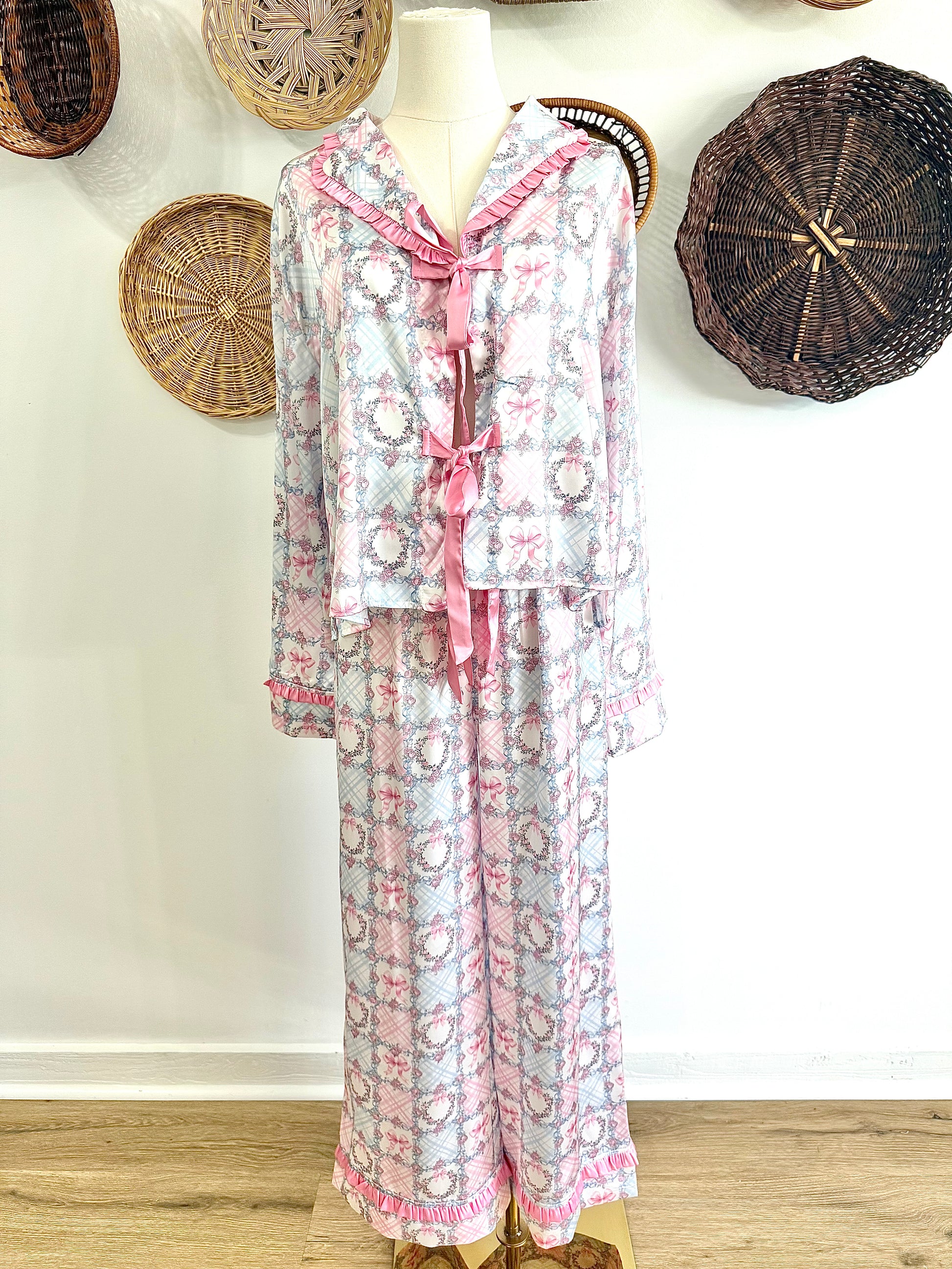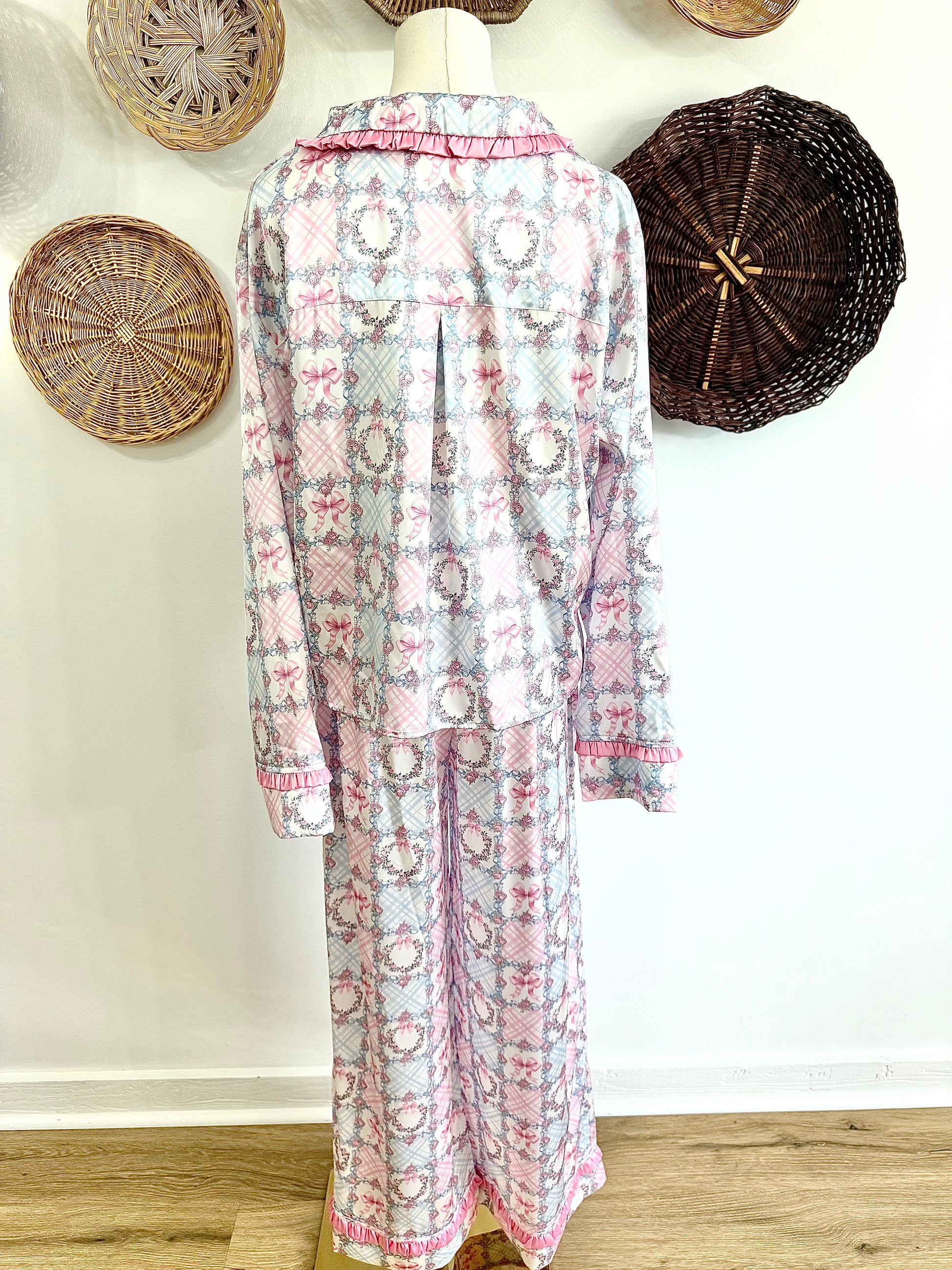 The Avie Floral & Bow Print Ruffle Pajama Set in Blue & Pink
