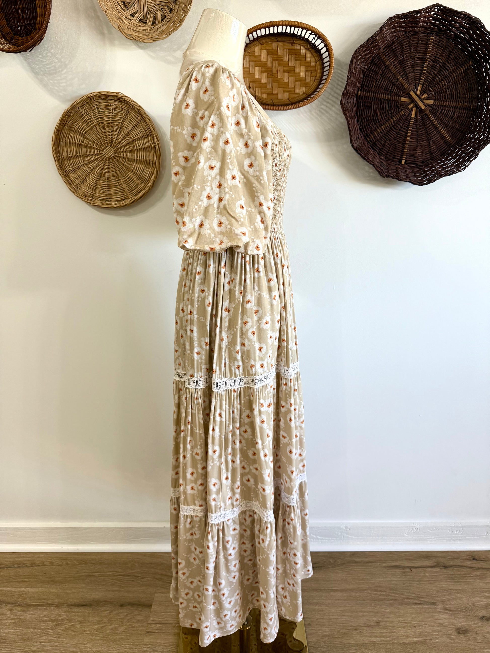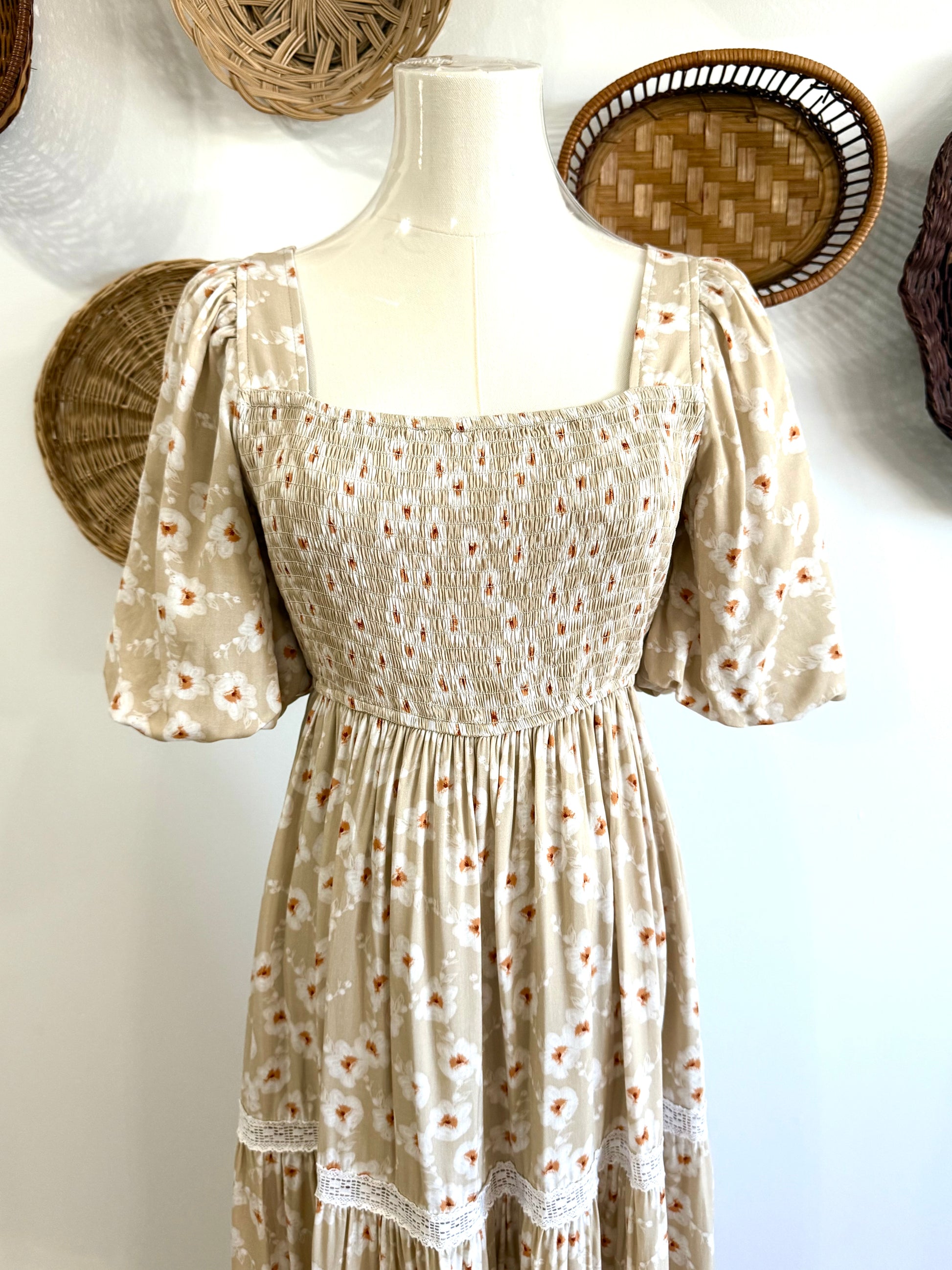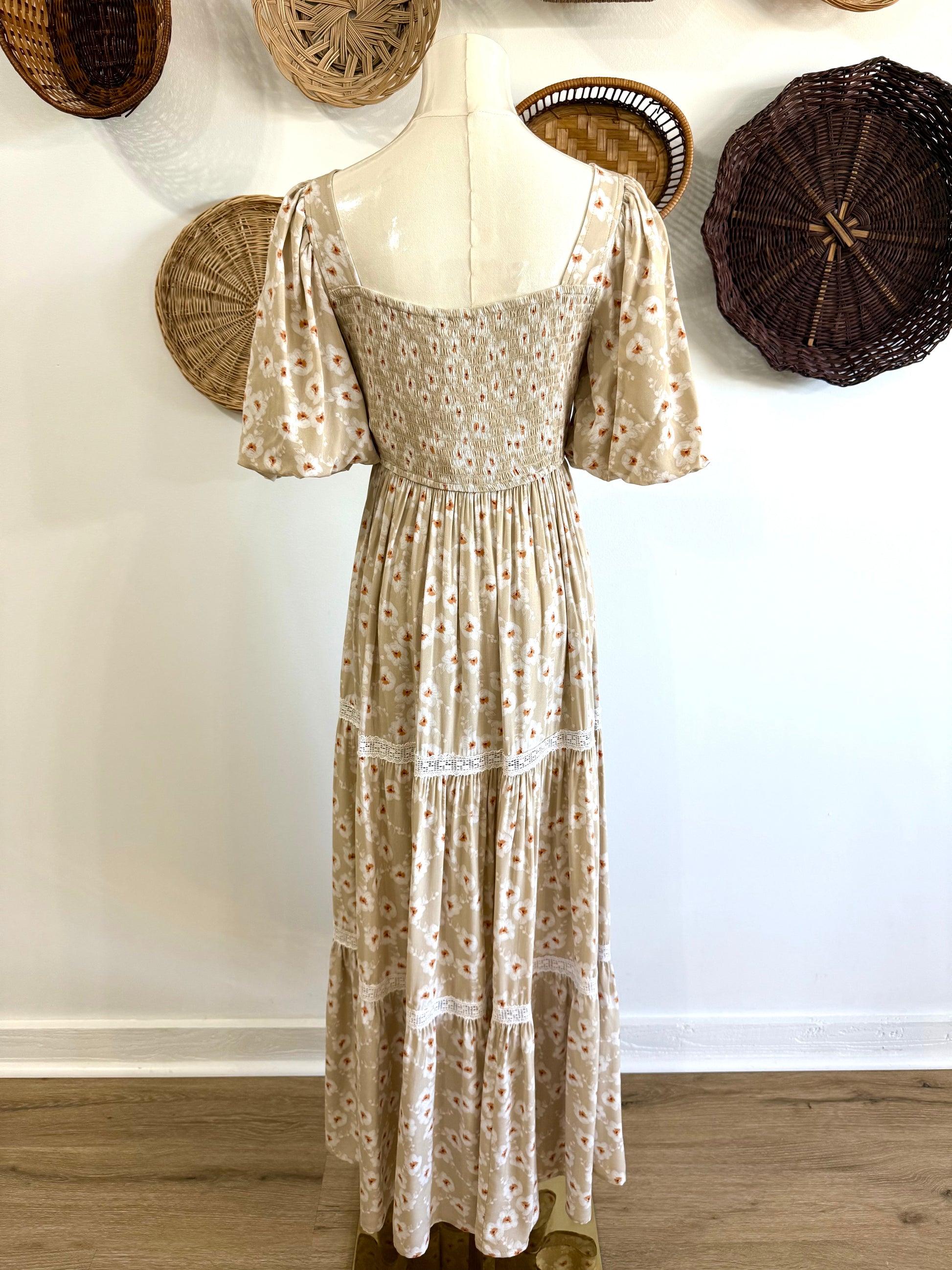 The Ayla Puff Sleeve Floral Maxi Dress in Tan