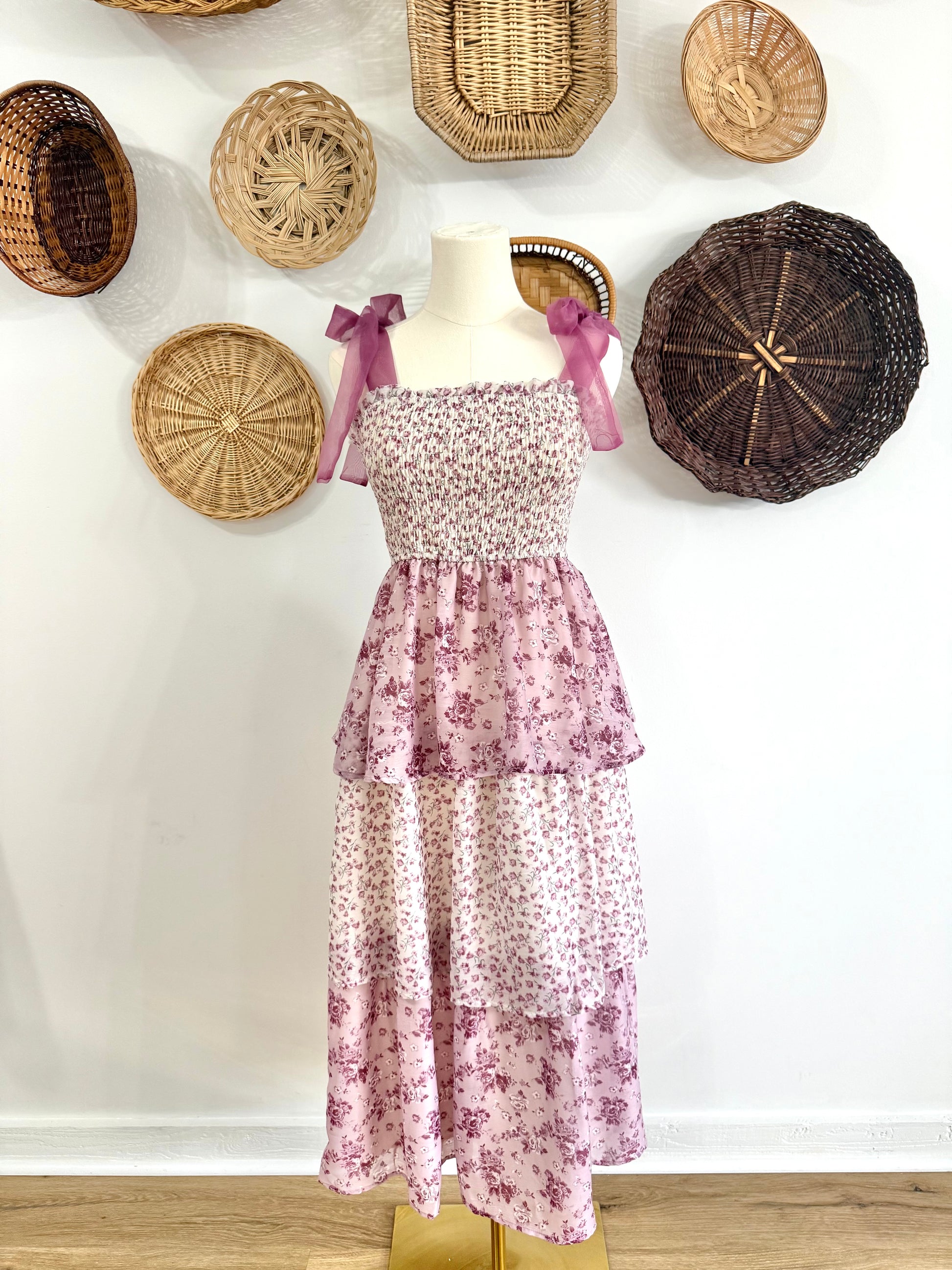 The Carden Ruffle Tiered Floral Maxi Dress in Mauve