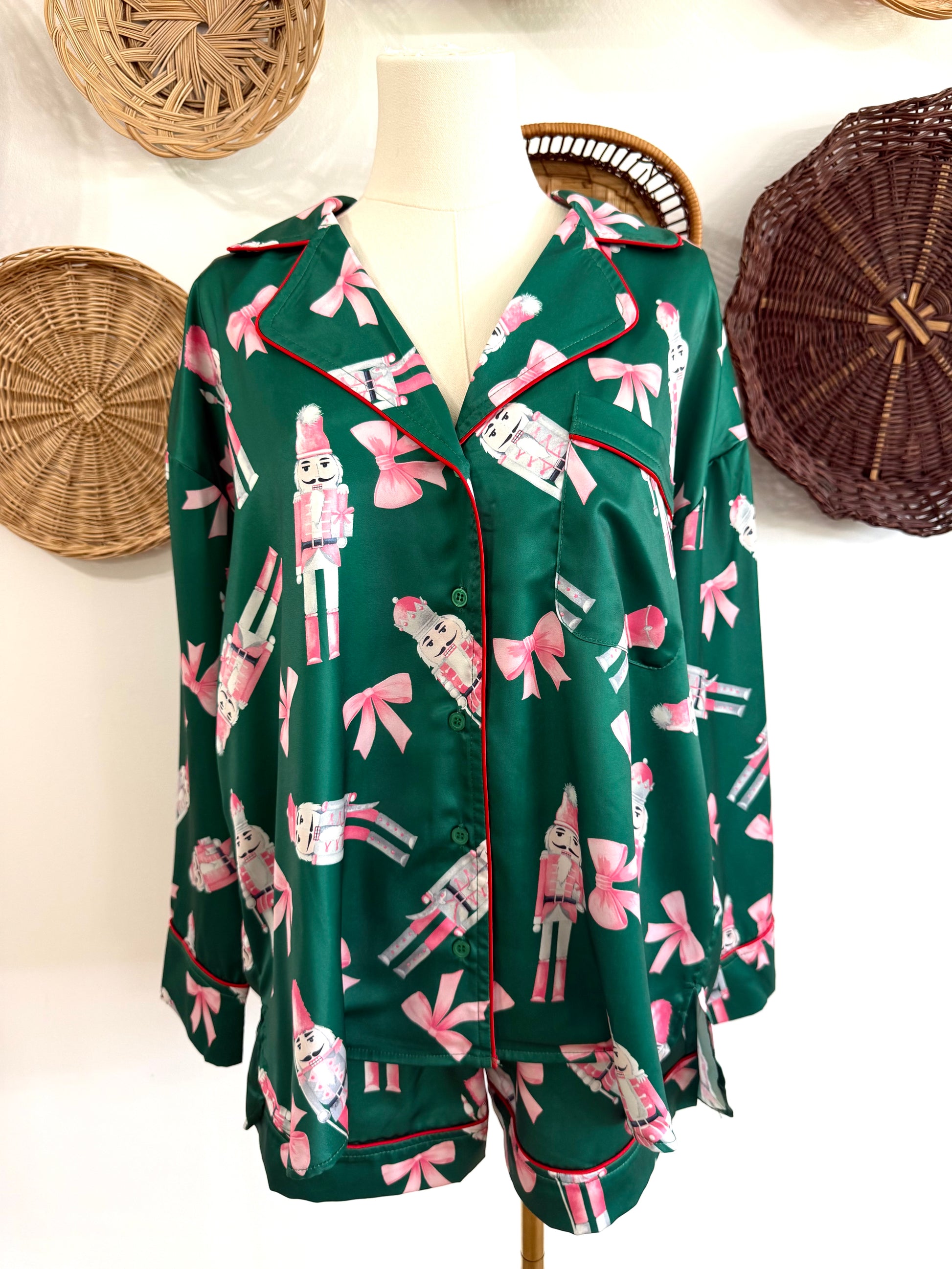 Festive and luxe! This emerald green satin pajama set features playful pink nutcrackers and bows-perfect for cozy holiday nights in style.