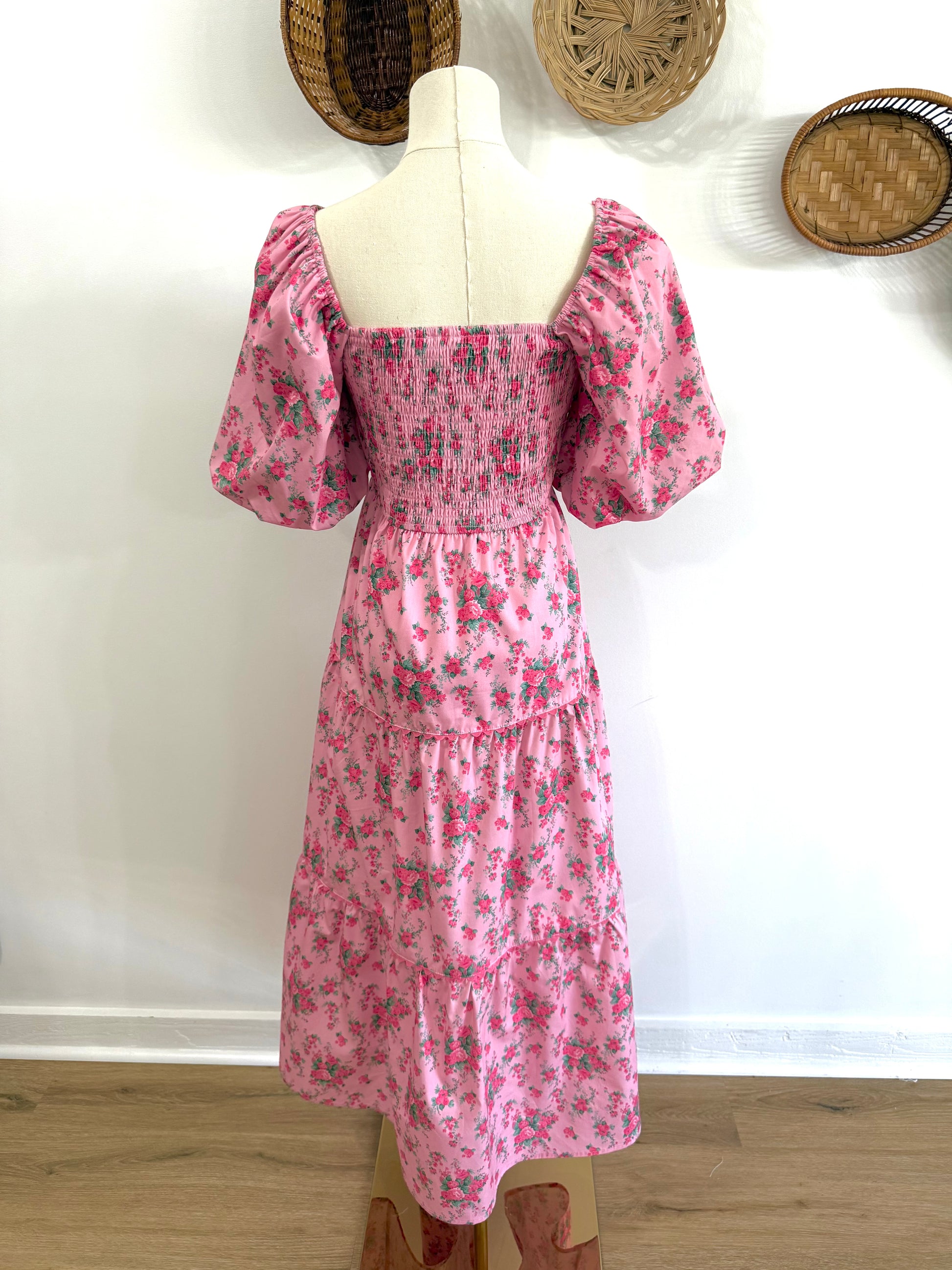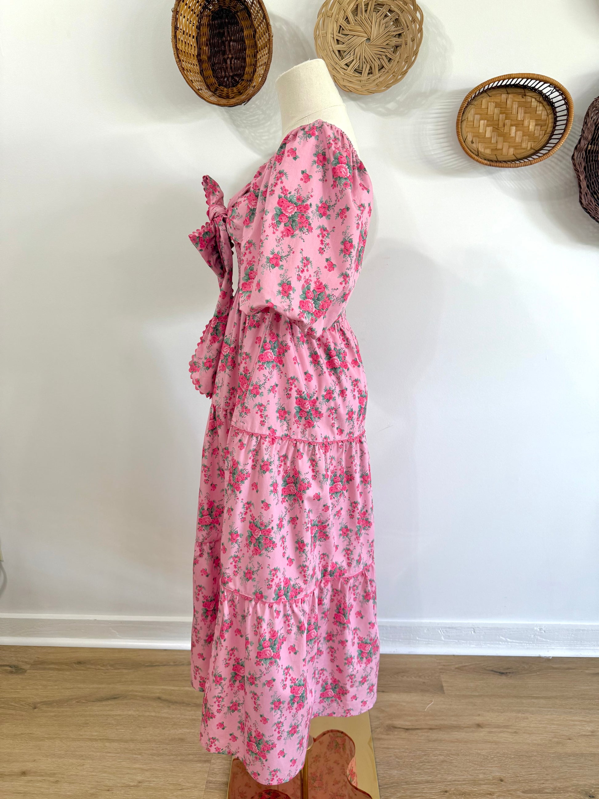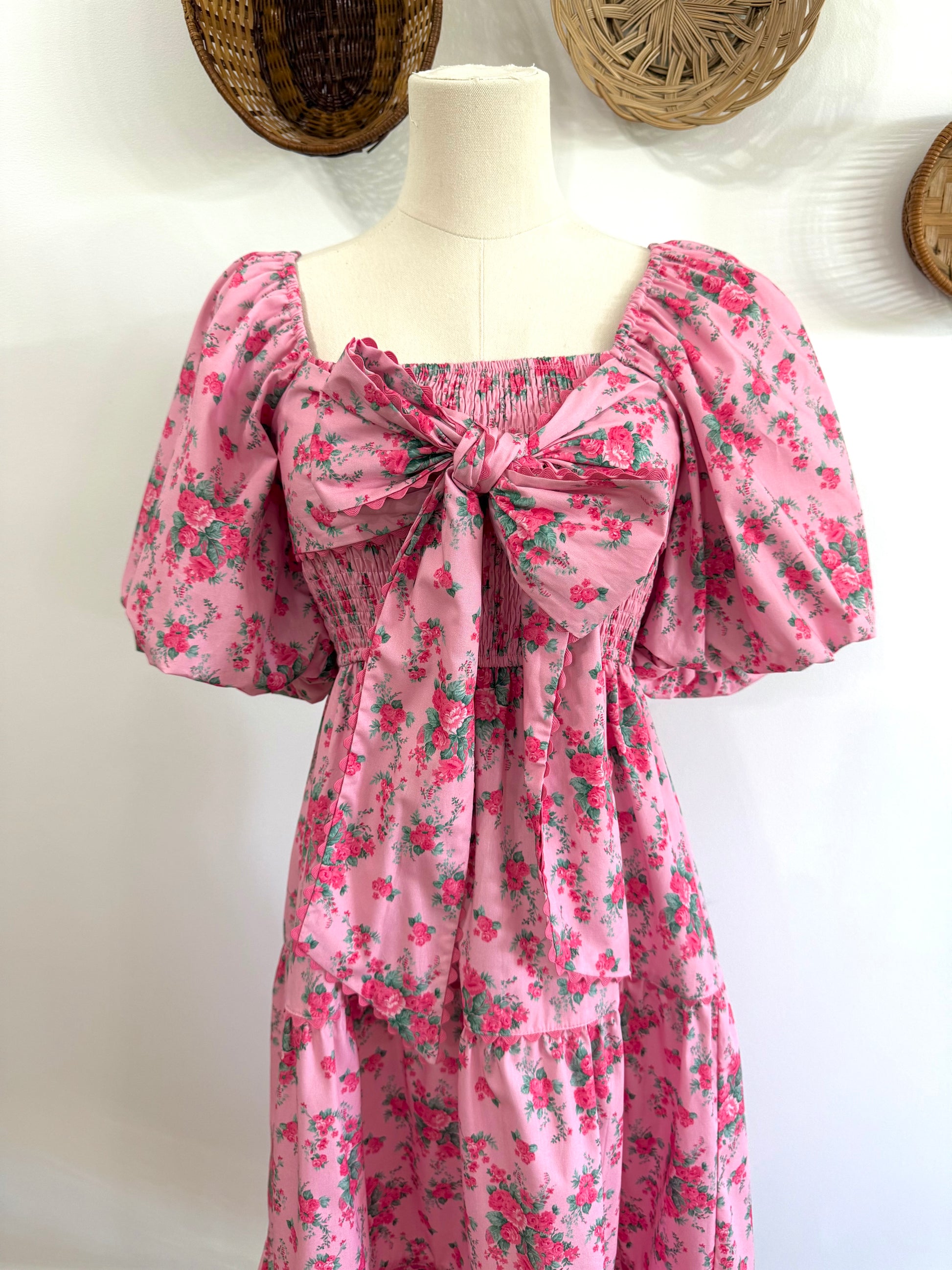 The Everlynn Puff Sleeve Bow Detail Floral Maxi Dress in Pink