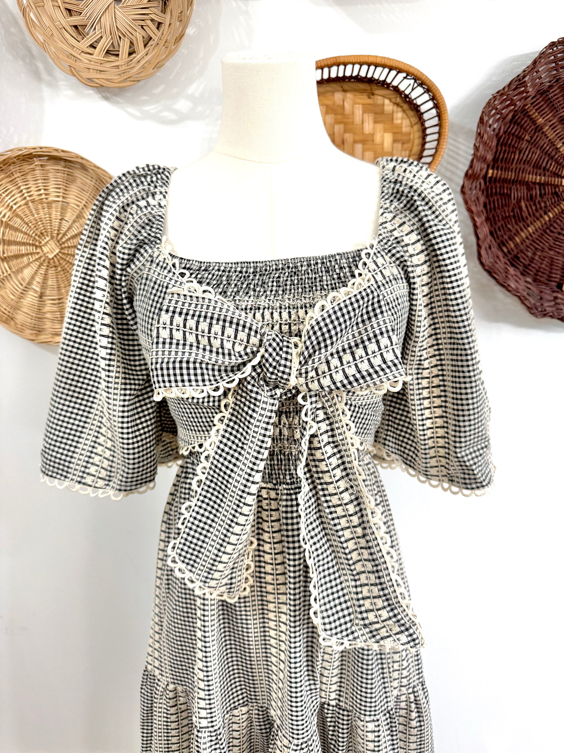 Preppy gingham meets boho romance in this bow-front maxi. With flutter sleeves, tiered skirt, and crochet lace trim, it’s effortlessly feminine and perfect for sunny days.