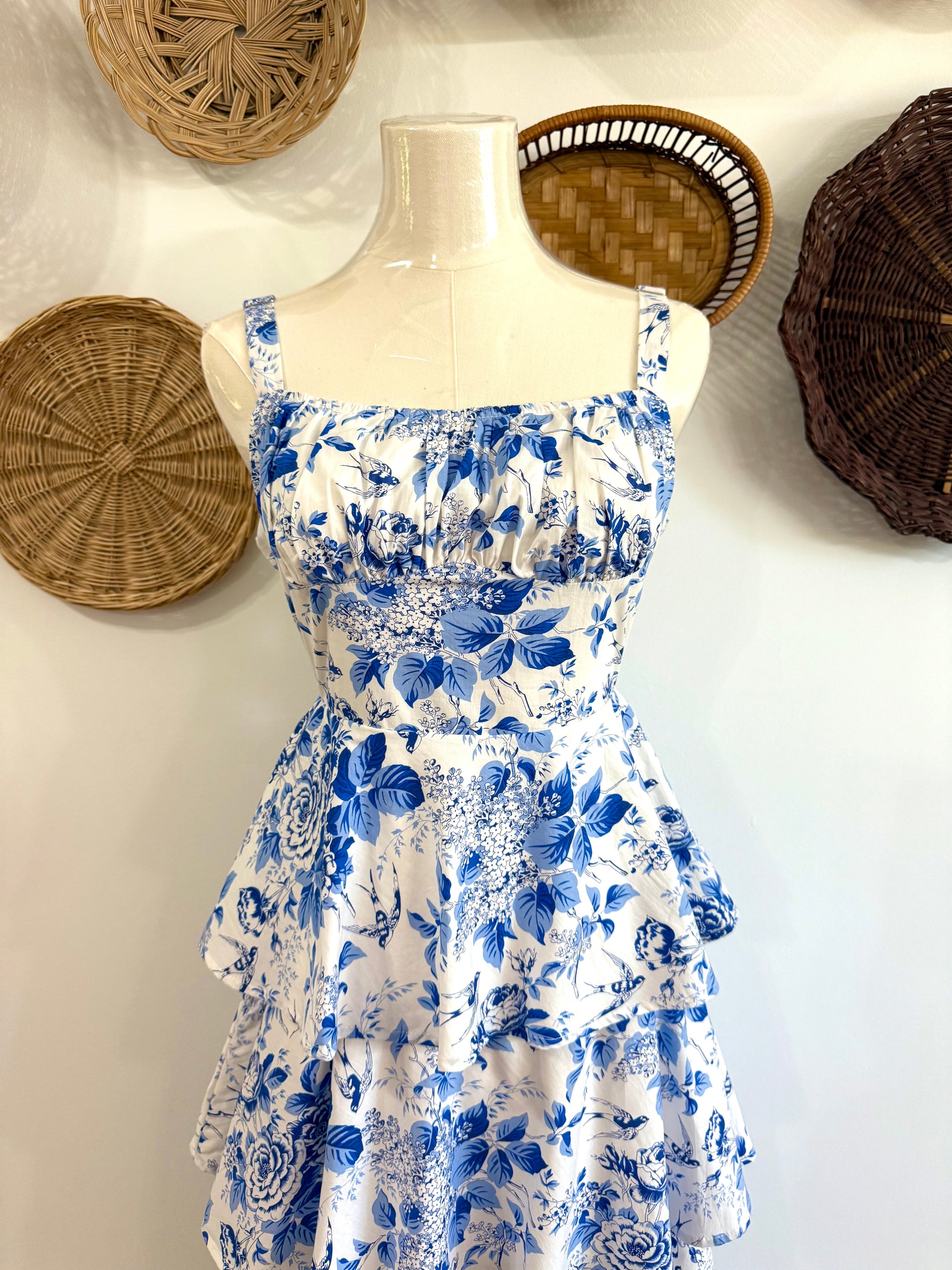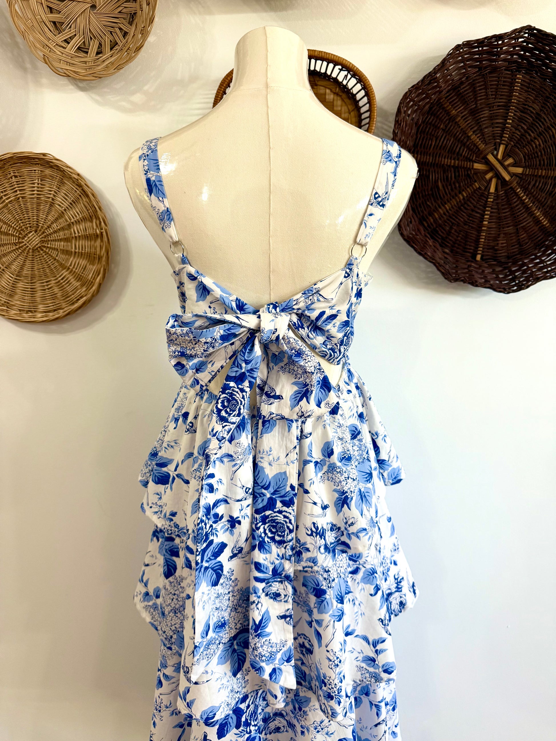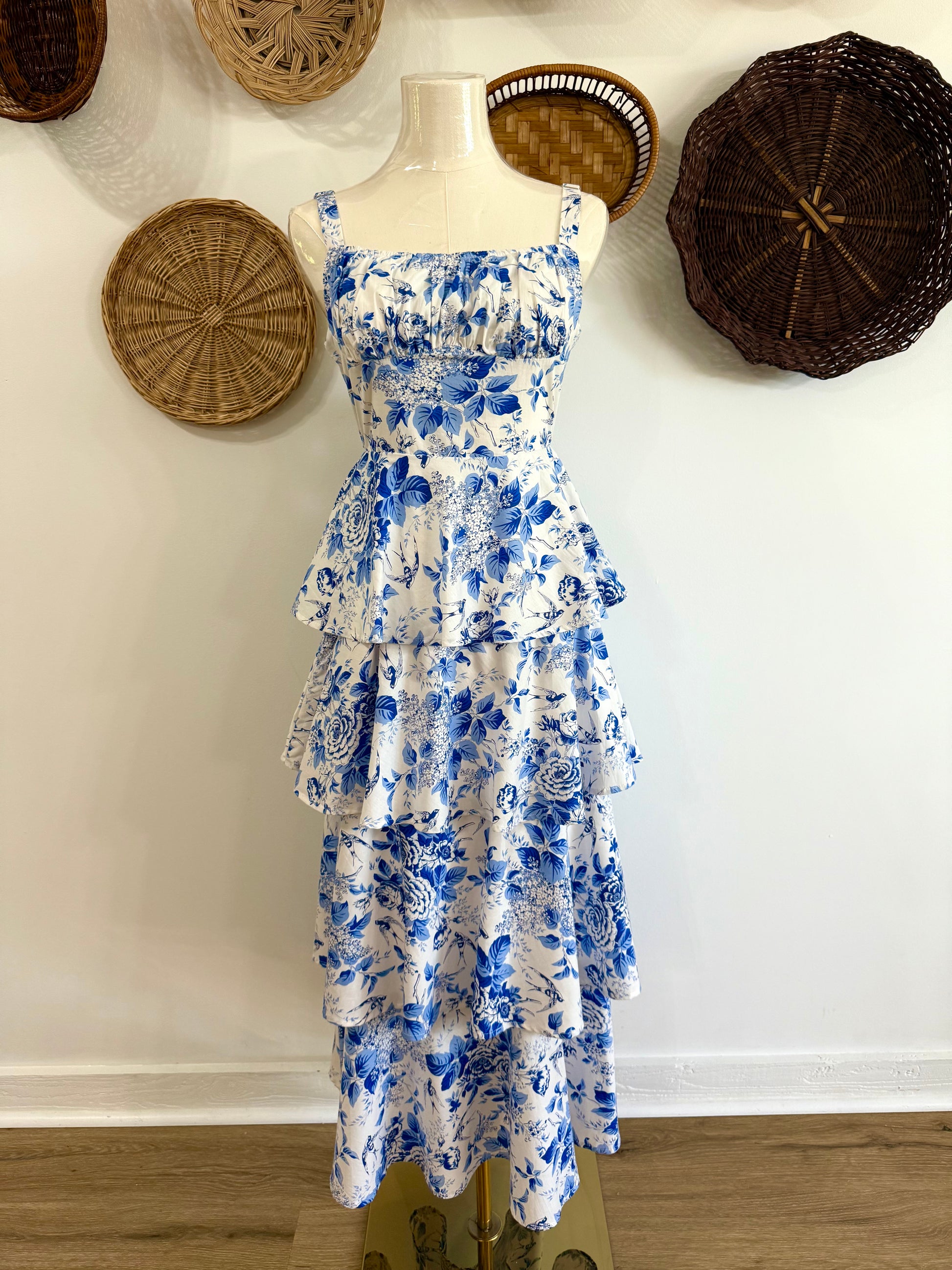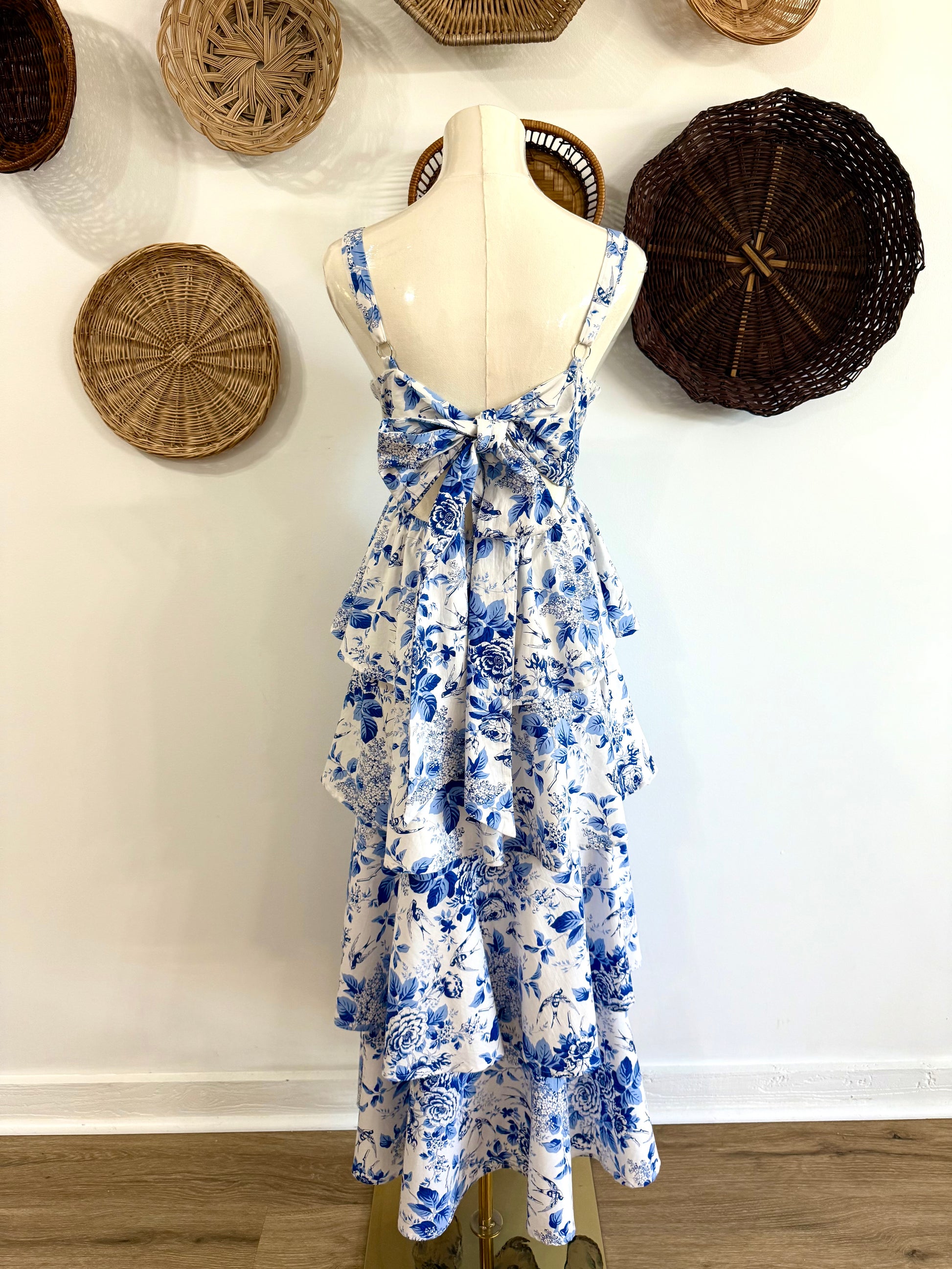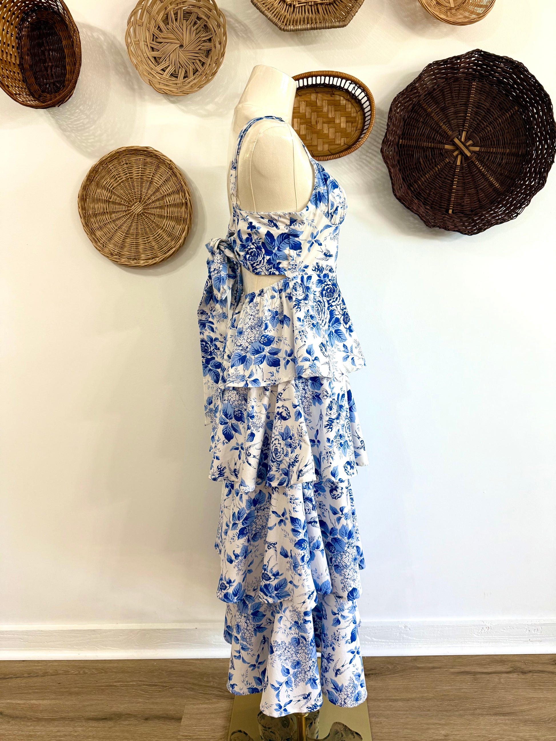 The Nicolette Floral Tiered Ruffle Maxi Dress in Blue & White