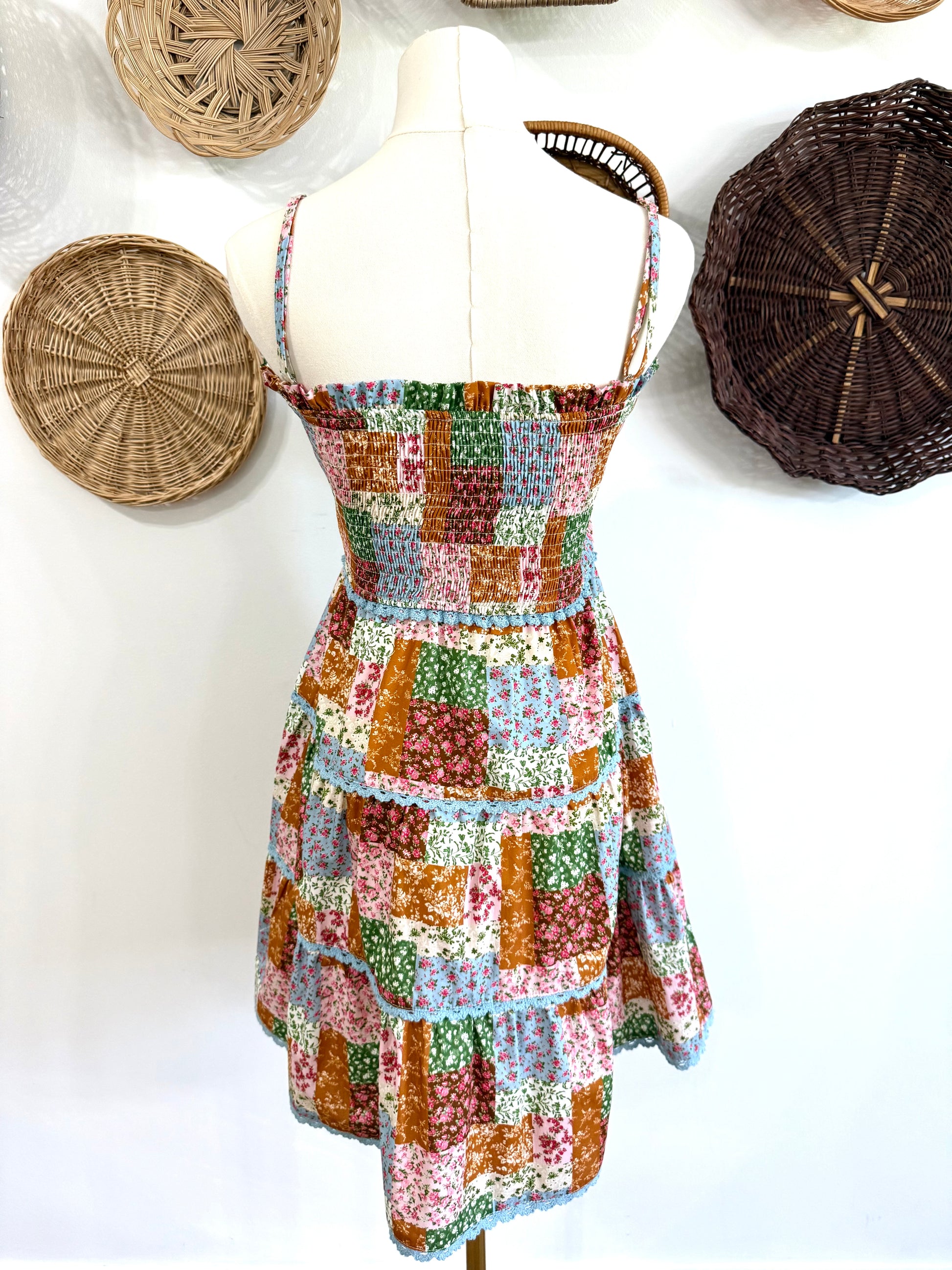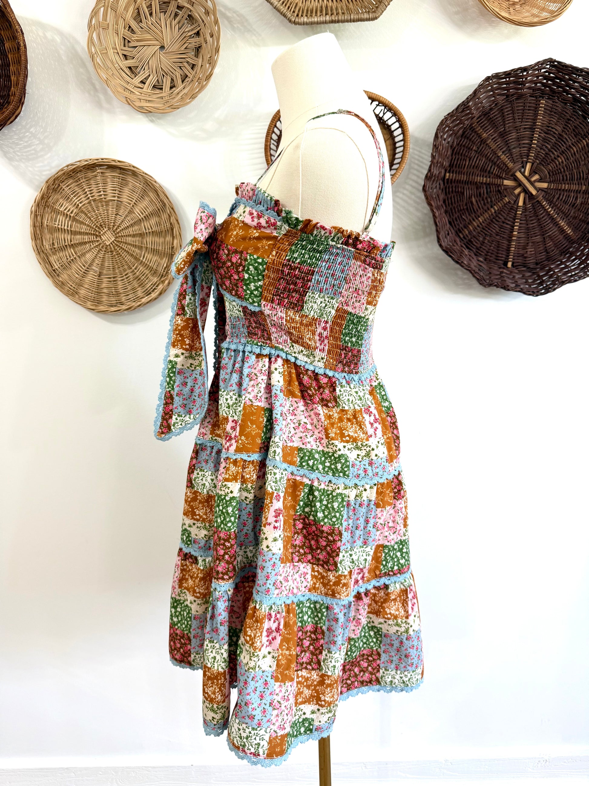 Fall-ready and effortlessly boho! This quilt patchwork print dress features rich autumn colors, ric rac detailing, and a smocked top with a playful front bow tie.