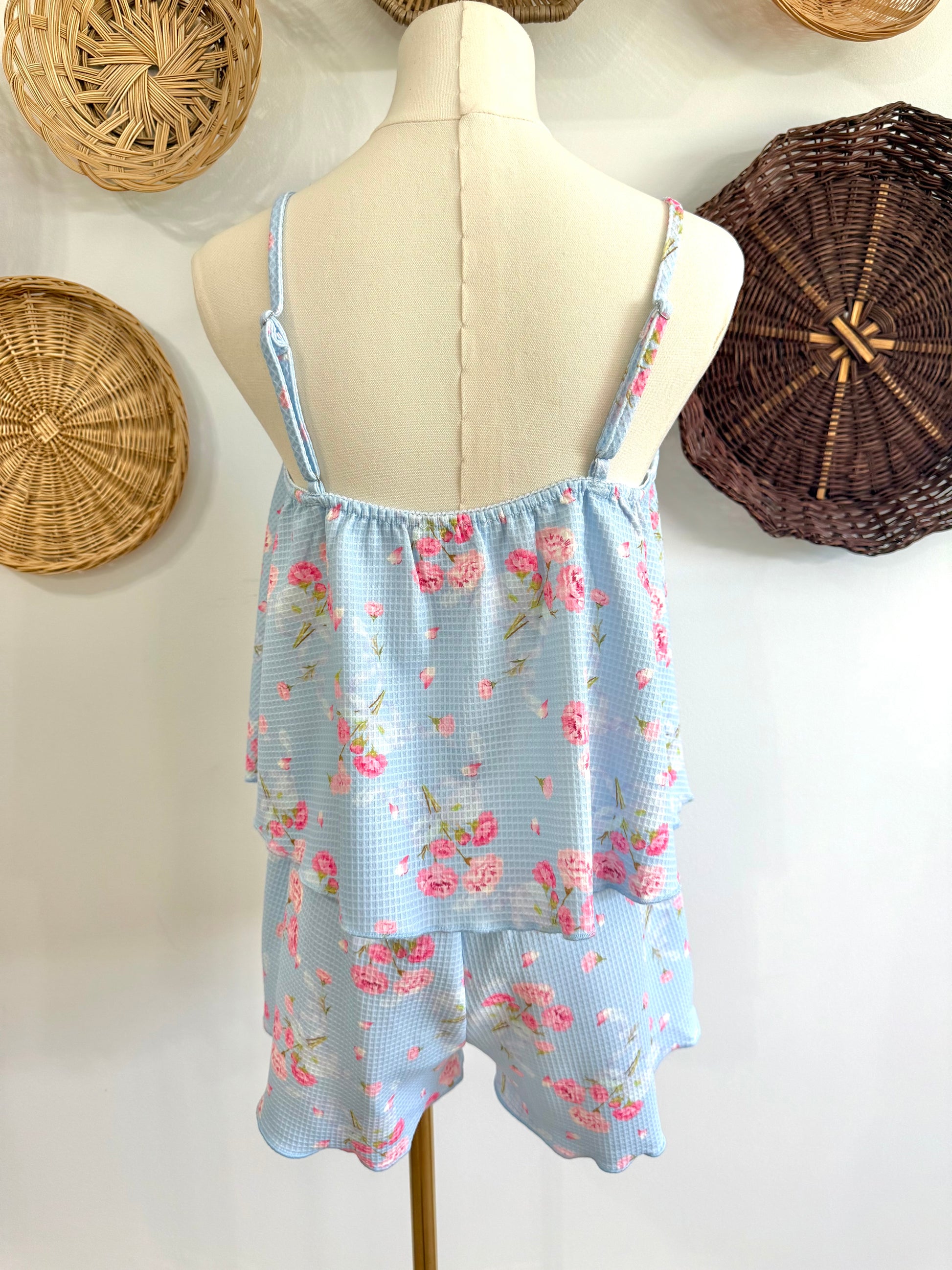 Cozy meets cute! This blue waffle pajama set features pink florals, delicate lace, and a sweet bow on the top-perfect for lounging in style.